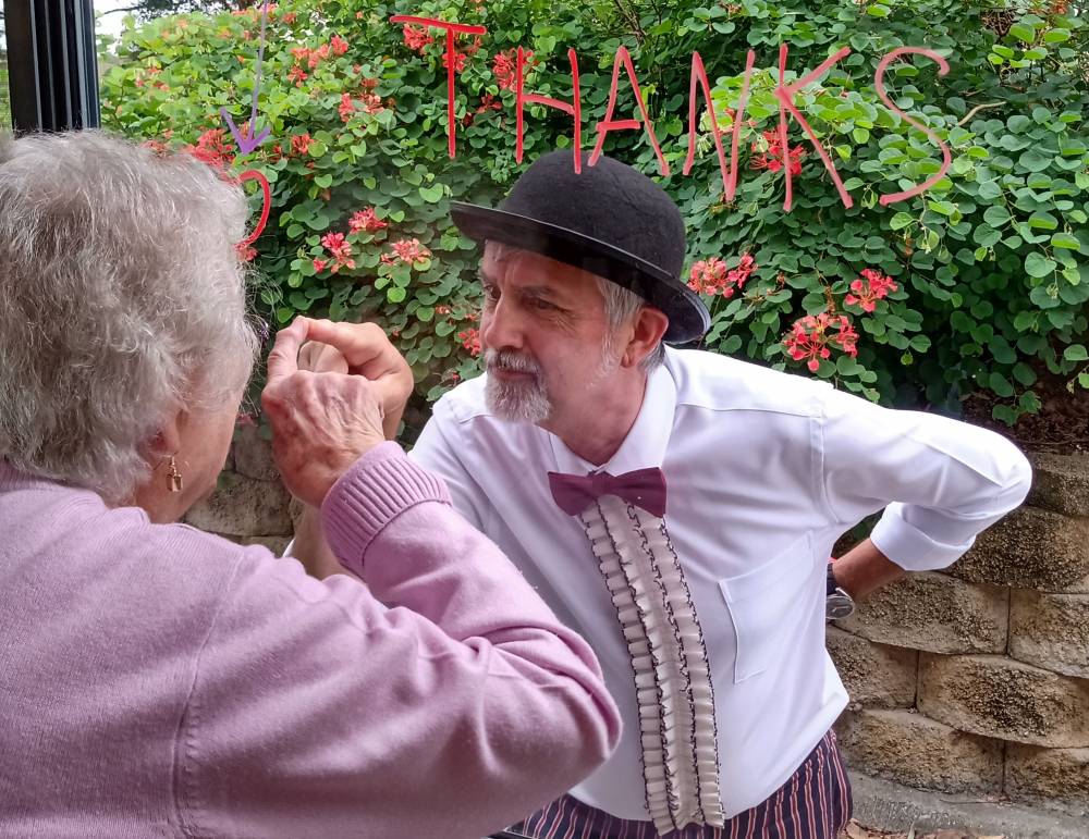 In what can best be described as a combination between Charlie Chaplin, Graham Kennedy, and Norman Gunston, Maurie creates an interactive experience for residents that is driven by their own reactions.